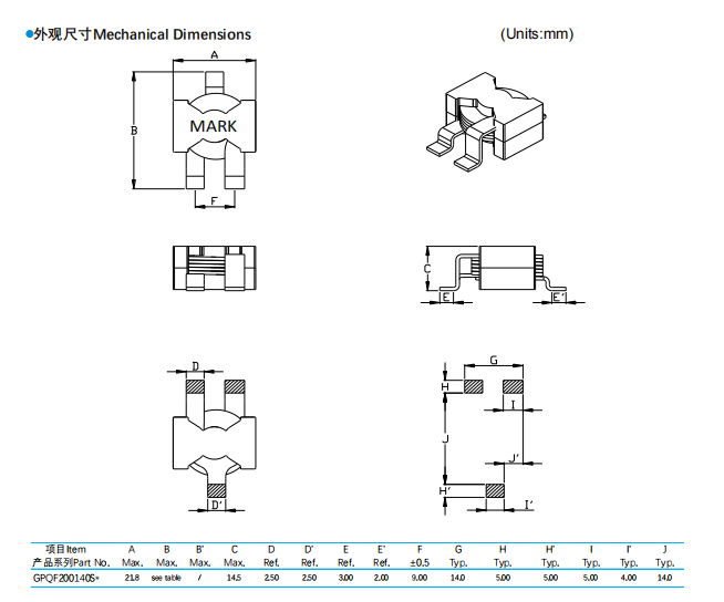 一、扁平線貼片電感GPQF200140產品特性:1、扁平線繞線結構,超低內阻2、超大電流承載能力,優異的熱穩定性3、安裝方式靈活,兼容PCB內嵌元件工藝 二、產品應?:1、?電流要求驅動電路濾波2、升壓或降壓電源電路轉換器三、封裝尺寸列表: